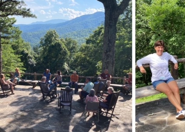 So … what was it like? Wildacres is set in the mountains of North Carolina not far from Ashville. The main lodge spills out to a big, beautiful flagstone patio with a breathtaking view of trees and mountains. There were benches and rocking chairs just begging for people to congregate, or to sit alone to listen to the muse and ponder the next paragraph. We were something like 80 to 100 writers of every ilk (poets, short story and flash fiction authors, non-fiction historians and memoir writers, essayists, and novelists – some published, some not), along with the faculty and organizers. It was indeed very like summer camp: a big bell rang to call us to meals, to classes, to events, and it was easy to meet people – we sat together at round tables for meals and gathered on the patio for happy hour every evening.